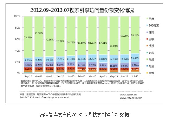 目前在国内,百度仍然占据互联网市场份额的榜首,谷歌已经退出中国大陆。互联网市场份额争夺是一场没有硝烟的大战,在不知不觉中这些数字已然发生变化。下面是易观的数据报告: