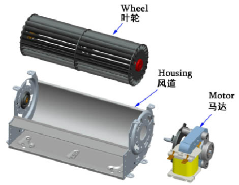 贯流风机主要由叶轮,风道和电动机三部分组成,叶轮材料一般为铝合金或工程塑料。铝合金叶轮强度高,重量轻,耐高温,能够保持长久平稳运转而不变形;塑料叶轮由模具注塑,再由超声波焊接而成,一般用于转速较低的场合,直径较大。