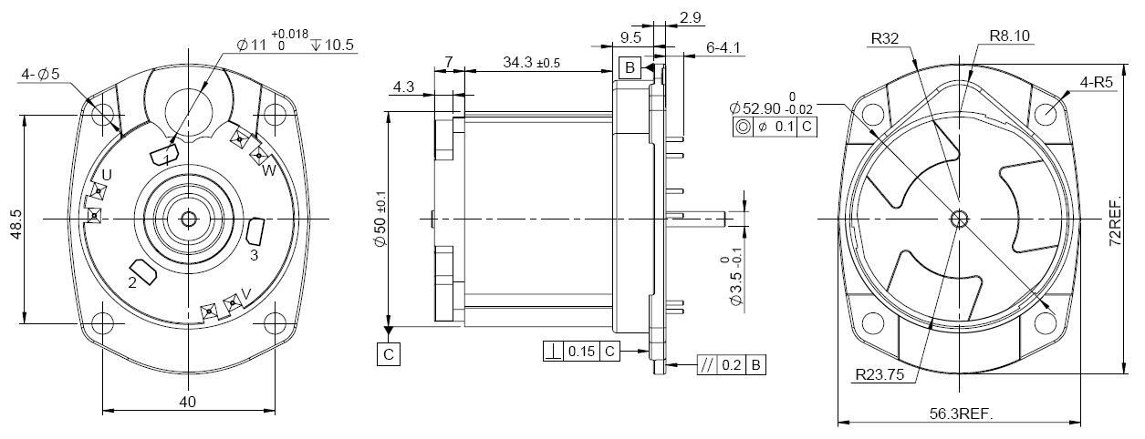 Notice: Data in this typical specification sheet are for other certain customer, the specific BLDC motor performance and dimension can be changed by adjusting winding, magnetic field, controller parameter and relevant mechanical factor to meet different customer requirement. 注意:上述规格仅针对特定客户,对于您的特殊要求,可以通过调整绕组、磁场、控制参数和相关机械参数来达到您的不同要求。 |
